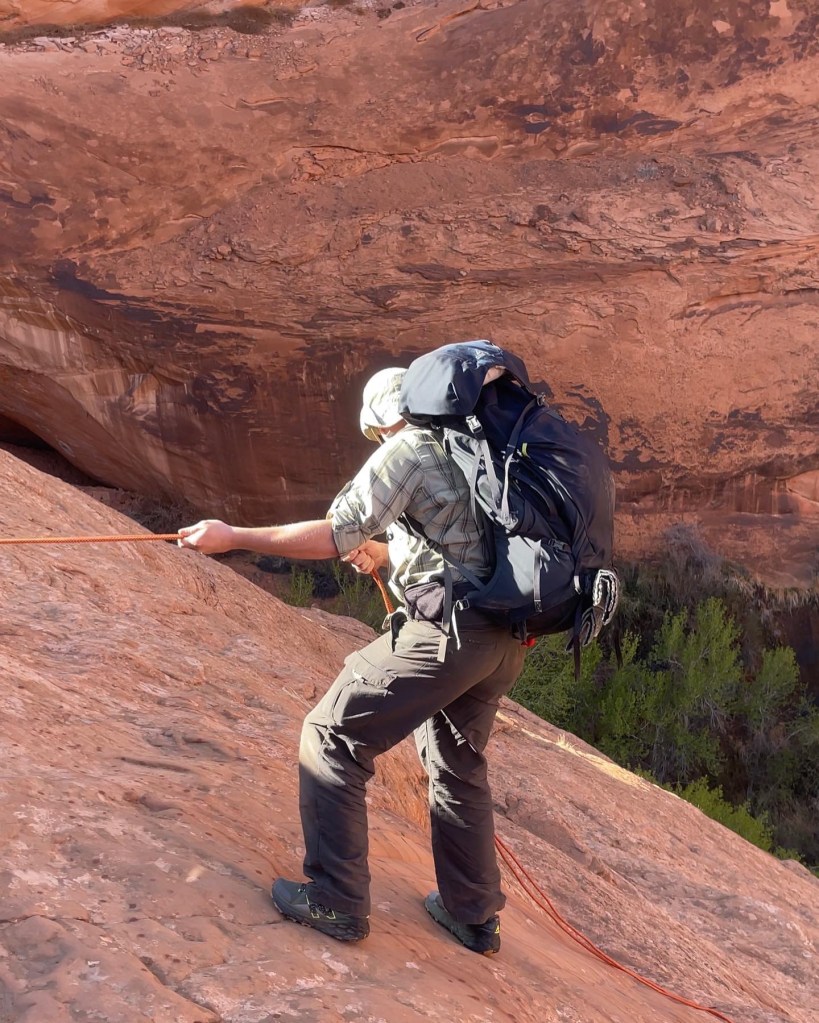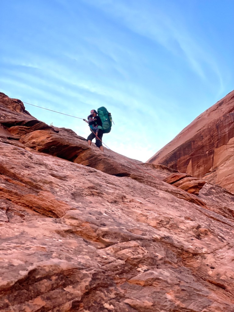 I recommend wearing trail shoes with plenty of tread. There’s a reason it’s called slick rock. Also, if you are bringing a kid in or out this direction I found the easiest way is to go down with a pack, drop pack and then go back up and soft carry them down. This trip we used the trail magik that hooks into our backpacks. Our kids were larger children so we had a lot of weight. We all are experienced with rappelling so it was manageable. I’d be nervous for someone who wasn’t to try this with that much unbalanced weight. Also, gloves will help save your hands. For reference with our rope, we hooked it up the climbers way and tie a figure 8 knot at the end. That way we can just untie and pull rope through anchor. We used a 200 ft rope. It barely reached. I know that’s a lot of rope to carry, but our kids safety was more important to us than carrying extra weight. If you’re afraid of heights this will not be a good route for you. I’ve seen a few meltdowns from other groups that also were roped. Rappelling with a heavy pack is a very different animal than rappelling with my canyoneering bag. In pics it looks tame. In real life you’ll encounter something very different.
