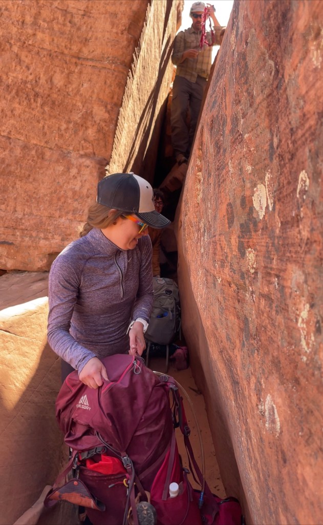 Finding the crack if you’ve never been there before requires gps. It doesn’t look like anything, but a sheer cliff face at first glance. The crack is narrow and you might question if it’s the right way. It is. There will be two spots you have to pull bags up at. We just used a daisy chain for this. A rope is overkill. Only one group can go through at a time. So be patient with others. There is no where to squeeze past once you start.